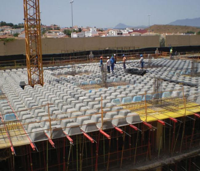 Obra ejecutada con forjados de casetón recuperable con la peculiaridad de que cada forjado era de un nervio y un canto diferente.