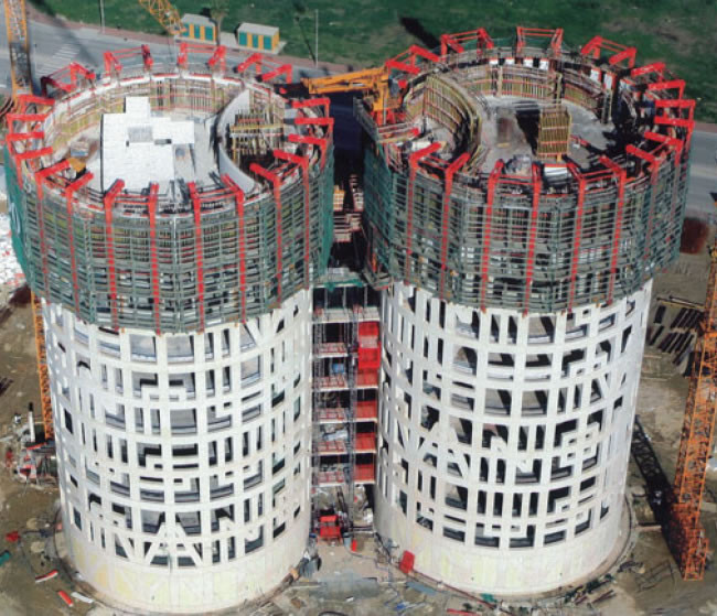 Ejecución de estructura singular y minuciosa en fachada de hormigón blanco visto, en la cual se puede leer la frase “NON PLUS ULTRA”.